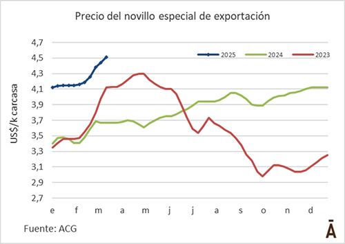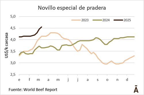 El intermediario manejó valores promedio de US$ 4,50 por kg carcasa para los mejores novillos, con un piso de US$ 4,40 y un techo de US$ 4,60 para negocios puntuales. Para la vaca gorda, reportó una cotización promedio de US$ 4,15-4,20, y de US$ 4,30 para las vaquillonas. Las entradas siguen cortas, entre cinco días y una semana como máximo.