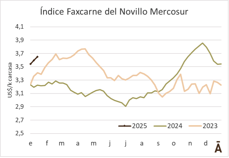 El valor medio del ganado a faena en los países del Mercosur aumentó por segunda semana consecutiva. El Índice Faxcarne del Novillo Mercosur subió 5 cents en la semana a US$ 3,65 el kilo carcasa, acumulando una recuperación de 11 cents desde que comenzó el año.
