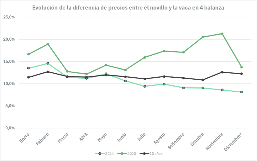La brecha entre el precio del novillo y la vaca gorda durante el año 2024 se acortó, principalmente en el segundo semestre. Según los datos publicados por el Instituto Nacional de Carnes (INAC), durante el año 2024 la brecha entre los valores del novillo gordo y la vaca gorda en cuarta balanza (incluyendo animales de corral y de campo) fue del 10,5% en promedio, mientras que en 2023 había sido de 15,9% y de 11,7% en el promedio de los últimos 10 años (2014-2023).