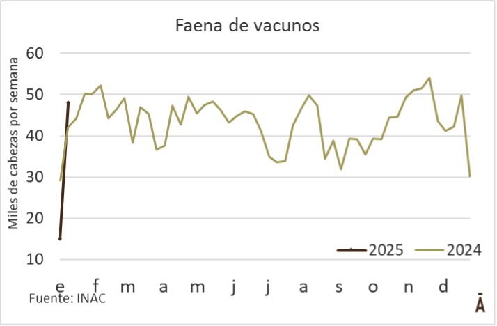 En la semana al 11 de enero se faenaron en frigoríficos habilitados 48.086 vacunos, de acuerdo con lo informado por el INAC. Fue la segunda de las últimas siete semanas en las que no hubo alteraciones en el ritmo de actividad por medidas gremiales y en ambas la faena creció a algo menos de 50 mil vacunos.