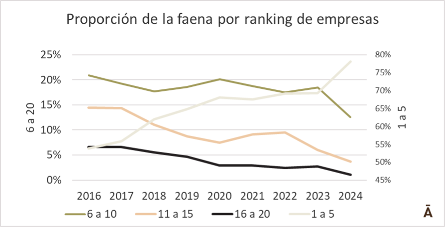 La tendencia hacia la concentración del sector frigorífico en Uruguay se aceleró en 2024. De acuerdo con los datos anuales informados por el INAC el año pasado las cinco principales empresas del sector (Marfrig, Minerva, familia Urgal, Las Piedras y Las Moras) faenaron 1,76 millones de vacunos, 78,1% del total. Aunque los dos principales grupos, Marfrig y Minerva, faenaron una proporción mínimamente inferior a la de 2023 (48,5%, contra 48,7% el año anterior), las empresas ubicadas entre el puesto 3 al 5 crecieron de 20,6% del total a 29,6%. Esta concentración se dio fundamentalmente por la absorción de frigorífico San Jacinto por parte de la familia Urgal, con lo que esta empresa prácticamente duplicó su actividad en el año (+97%). Además, la faena de Las Piedras aumentó 11% anual y la de Chiadel SA (Las Moras) 7%.