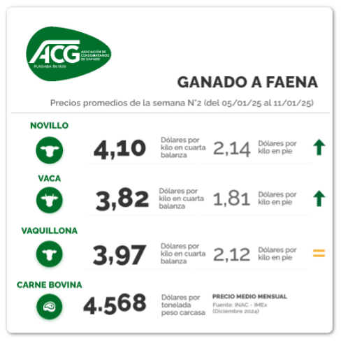 Los valores de la hacienda en la semana cerrada al 11 de enero se mantuvieron “estables”, con un “mercado firme”, según el comentario de la ACG de este lunes 13 de enero. El novillo gordo quedó con una referencia promedio de US$ 4,10 por kg carcasa (+1 cent), la vaca en US$ 3,82 (+1 cent) y la vaquillona en US$ 3,97 (=).