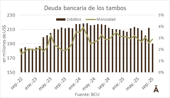 Los tambos tenían créditos con la banca pública y privada por unos US$ 190 millones, su menor volumen desde febrero de 2023. La cartera de préstamos en condición de vencidos se mantiene baja, sobre un eje del 2,8%.