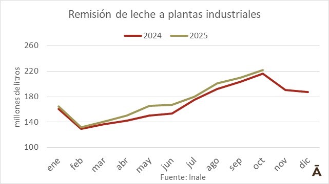 Aunque la remisión de leche se expandió en la comparación interanual en el pico estacional de primavera de octubre, lo hizo con una tasa más moderada que meses previos.