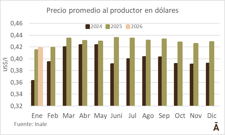 En dólares corrientes, la apreciación del tipo de cambio amortiguó parcialmente ese descenso. En enero, el valor medio fue de US$/lt 0,42, en baja del 2,3% respecto a diciembre, pero 0,8% por encima de enero de 2025.