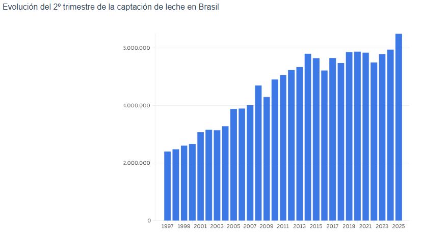 Según datos preliminares de la Encuesta Trimestral de Leche del IBGE, la captación formal de leche en Brasil alcanzó los 6.500 millones de litros en el segundo trimestre de 2025, un aumento del 9,3% en el promedio trimestral en comparación con el mismo período de 2024.