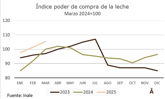 El índice de poder de compra de la leche en pesos en marzo cerró en 105 y subió 5,4% respecto al mismo mes de 2024, con un aumento mayor del índice de precio de leche (+11,9%) acompañado por una menor alza del índice de costos (+6,1%), según el Inale.