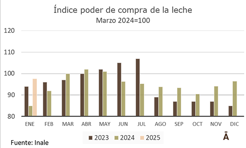 El índice de poder de compra de la leche en pesos cerró en enero en 98, avanzó 1,3% versus diciembre y 15,3% respecto al mismo mes de 2024. Según el Inale, se trata del mayor poder de compra de la leche desde mayo del año pasado (101), tomando el nuevo año base (marzo 2024=100). El precio de la leche en pesos tuvo un aumento del 19% en el último año, mientras que los costos en pesos avanzaron 3,3% en igual período. Las industrias pagaron un precio medio de $ 16,85 por litro por la remisión de enero (US$/lt 0,39).