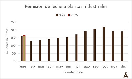 La remisión de leche a plantas industriales totalizó 165 millones de litros en enero, un aumento interanual de 2,2% y un máximo desde que se llevan registros, según los datos preliminares que divulgó el Inale. Asimismo, se procesaron 12,5 millones de kg de sólidos (grasa + proteína) en enero, lo que supuso un aumento interanual del 3,5%. La grasa promedio del pasado mes fue de 3,88%, mientras que la proteína se ubicó en 3,51%.