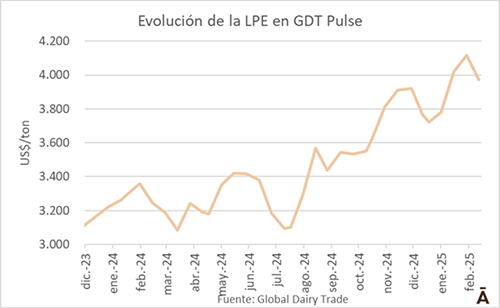 La subasta 73 de Global Dairy Trade (GDT) Pulse, la cuarta de 2025 en este sistema frenó la tendencia alcista que traía la leche en polvo entera (LPE). El pasado 18 de febrero, en el remate tradicional de GDT, la LPE había mostrado una baja marginal del 0,2%.