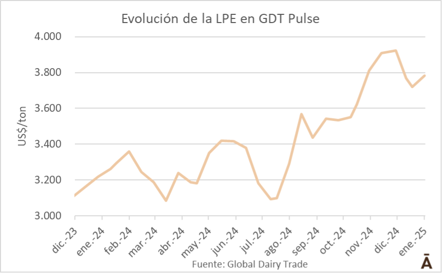 La subasta 70 de Global Dairy Trade (GDT) Pulse, la primera de 2025 en este sistema cambió la tendencia bajista que se había registrado en las últimas ventas del mes de diciembre de 2024. En esta oportunidad, con ventas únicamente de Fonterra como es tradicional, la leche en polvo entera (LPE), tanto regular como instantánea, y leche en polvo descremada (LPD) cerraron con subas en sus cotizaciones, siendo aún mayor la suba si se observa el comportamiento de los valores con respecto a un año atrás.