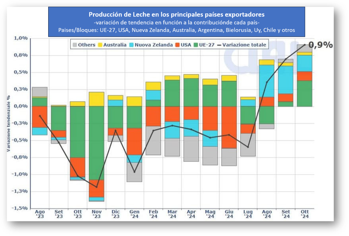 En los últimos meses de 2024 la oferta de leche en los principales países exportadores mostró una recuperación respecto al año anterior, con un aumento del 0,9% en octubre en términos interanuales. Oceanía, EEUU y la UE-27 lideran esta recuperación de la producción, apoyada también por una recuperación en América del Sur.