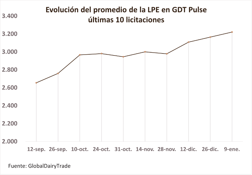 La licitación 348 de la plataforma electrónica GlobalDairyTrade de este martes 16 de enero registró un incremento del 2,3% en el promedio de los lácteos, sumando así la cuarta suba consecutiva. El promedio de la plataforma de subasta, donde mayormente se comercializa productos de Fonterra, cerró en US$ 3.493 por tonelada (+US$/ton 130).