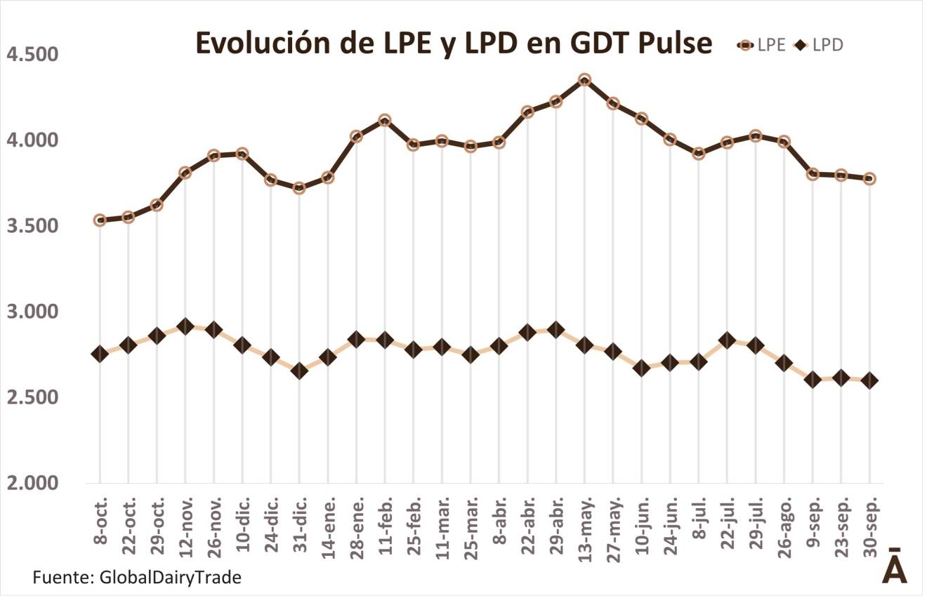 La subasta 90 de Global Dairy Trade (GDT) Pulse, la última del mes de septiembre, volvió a marcar un nuevo descenso en las cotizaciones y cerró el mes acumulando una baja del 5,4% para la leche en polvo entera (LPE) y del 3,8% para la descremada (LPD). En esta oportunidad, con ventas únicamente de Fonterra, la leche en polvo entera (LPE), tanto regular como instantánea, y leche en polvo descremada (LPD) sumaron 2.459 toneladas comercializadas, un 5,3% más que la semana pasada. De LPE se comercializaron 1.405 toneladas, en tanto que de LPD se comercializó 1.054 toneladas.