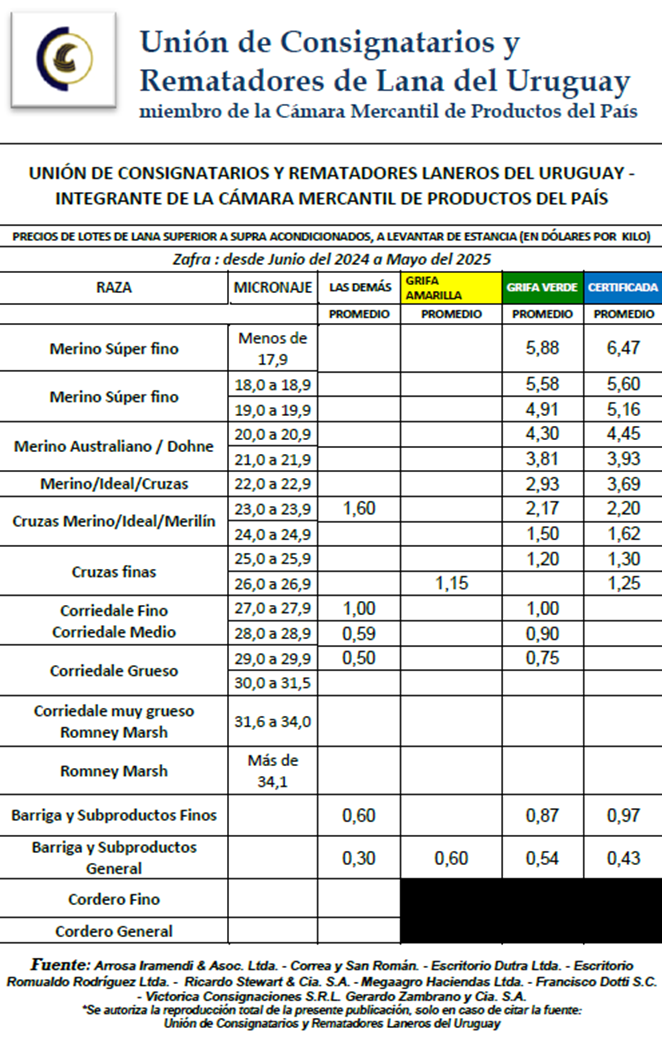 La Unión de Consignatarios y Rematadores de Lana del Uruguay, integrante de la Cámara Mercantil de Productos del País, dio a conocer los precios promedios correspondientes a la zafra 2024/25, calculados sobre la base de los negocios concretados entre el 1º de junio de 2024 y el 31 de mayo de 2025 por las firmas asociadas a la institución. De acuerdo con la información difundida, la zafra 2024/2025 mantuvo una firme demanda, en línea con el dinamismo que ya se observaba al cierre del ciclo anterior. Este sostenido interés posibilitó la comercialización de una porción significativa del volumen disponible, tanto por parte de productores como de exportadores, alcanzando valores similares a los registrados en la zafra 2023/2024.