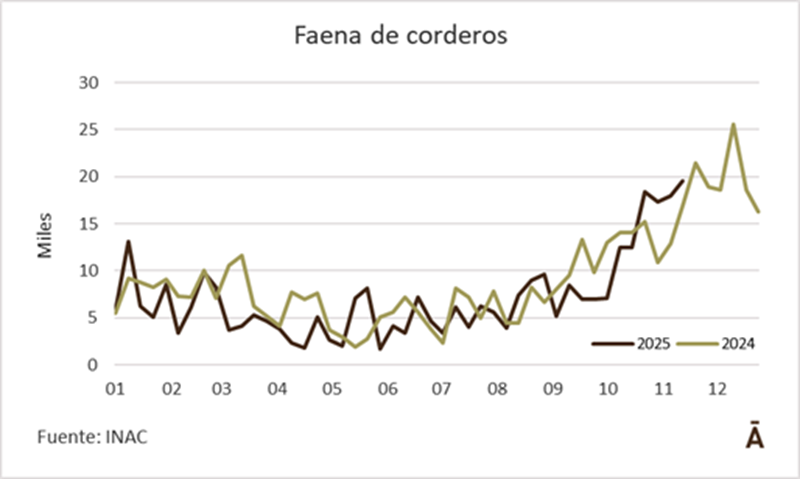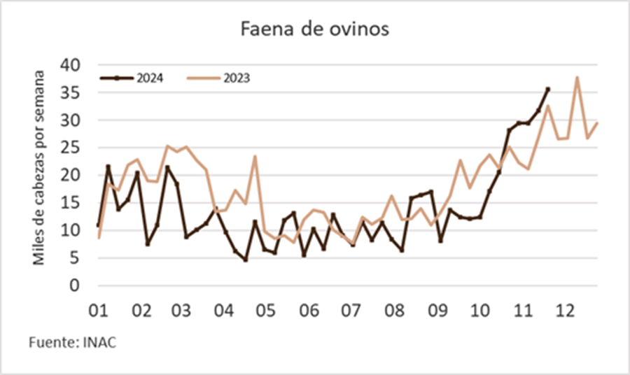 Por cuarta semana consecutiva la faena de ovinos superó a la de la misma semana del año pasado, en una tendencia que es la contraria a la que ha predominado a lo largo de buena parte del año.