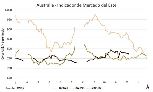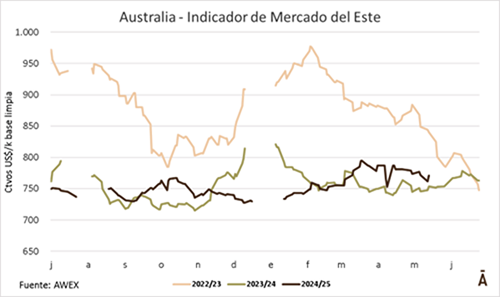 La semana en el mercado lanero australiano, finalizada el 7 de mayo de 2025, cerró con una tónica bajista en sus cotizaciones, influenciada por una combinación de factores que incluyeron la calidad de la oferta, una demanda altamente selectiva y la fluctuación de las monedas. El Indicador de Mercados del Este (IME) en moneda estadounidense cerró en US$ 7,72, dos centavos menos que el cierre de la semana pasada. En la moneda australiana, el IME se ubicó en A$ 11,91 por kilogramo base limpia al cierre del 7 de mayo, descendiendo 19 centavos respecto al pasado jueves 1º de mayo.