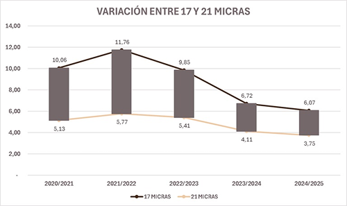 En el país, tradicionalmente, los productores solían hablar de la diferencia de precios que existía entre las lanas de 21 y 28 micras, pero el mercado lanero ha cambiado y a pesar de que la brecha de valores en estos micronajes continúa creciendo, también existe una diferencia importante entre las lanas finas. En la zafra 2021-22, las lanas de 17 micras llegaron a cotizar a más del doble de las 21 micras. En la presente zafra esta brecha de precios se ubica aproximadamente en el 62% en Uruguay, sin embargo, en Australia esta diferencia es menor.