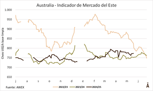 El Indicador del Mercado del Este (IME) cerró la semana en A$ 11,89 por kilogramo base limpia, en términos de variación semanal, el indicador mostró un descenso de 3 centavos respecto al cierre del pasado 9 de mayo. En tanto que en dólares estadounidenses el IME cerró el 14 de mayo en US$ 7,71, lo que significó una pérdida de solo un centavo en la semana.