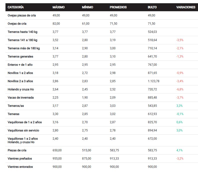 Los terneros generales promediaron US$/kg 3,10 por kg en pie (-1,3%) o US$ 642 al bulto, mientras que las vacas de invernada cerraron en US$/kg 2,09 (-3,7%). Por su parte, los novillos de 1 a 2 años se ubicaron en US$/kg 2,98 (-0,9%) y los de 2 a 3 años en US$/kg 2,85 (-3,4%).