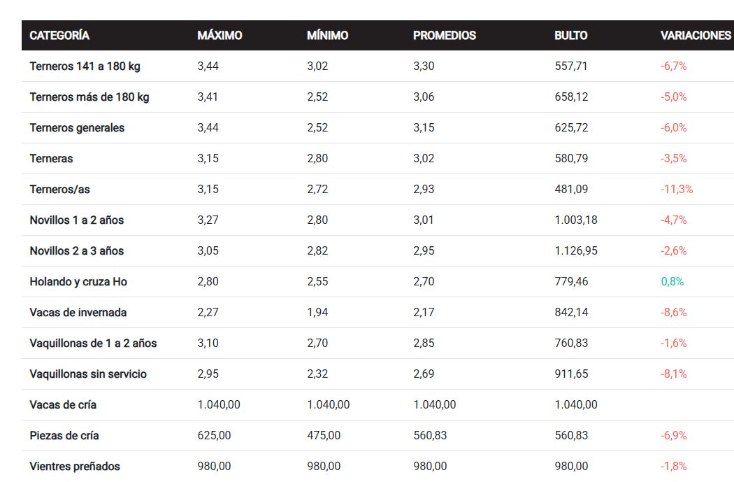 De acuerdo a los datos del consorcio del remate 236, los terneros hicieron un promedio general de US$ 3,15 por kg en pie (US$ 626 al bulto), en baja de 6% respecto el primer remate del mes. Las terneras, por su lado, hicieron US$ 3,02 de promedio (-3,5%), los novillos de 1 a 2 años US$ 3,01 (-4,7%), y los de 2 a 3 años US$ 2,95 (-2,6%).