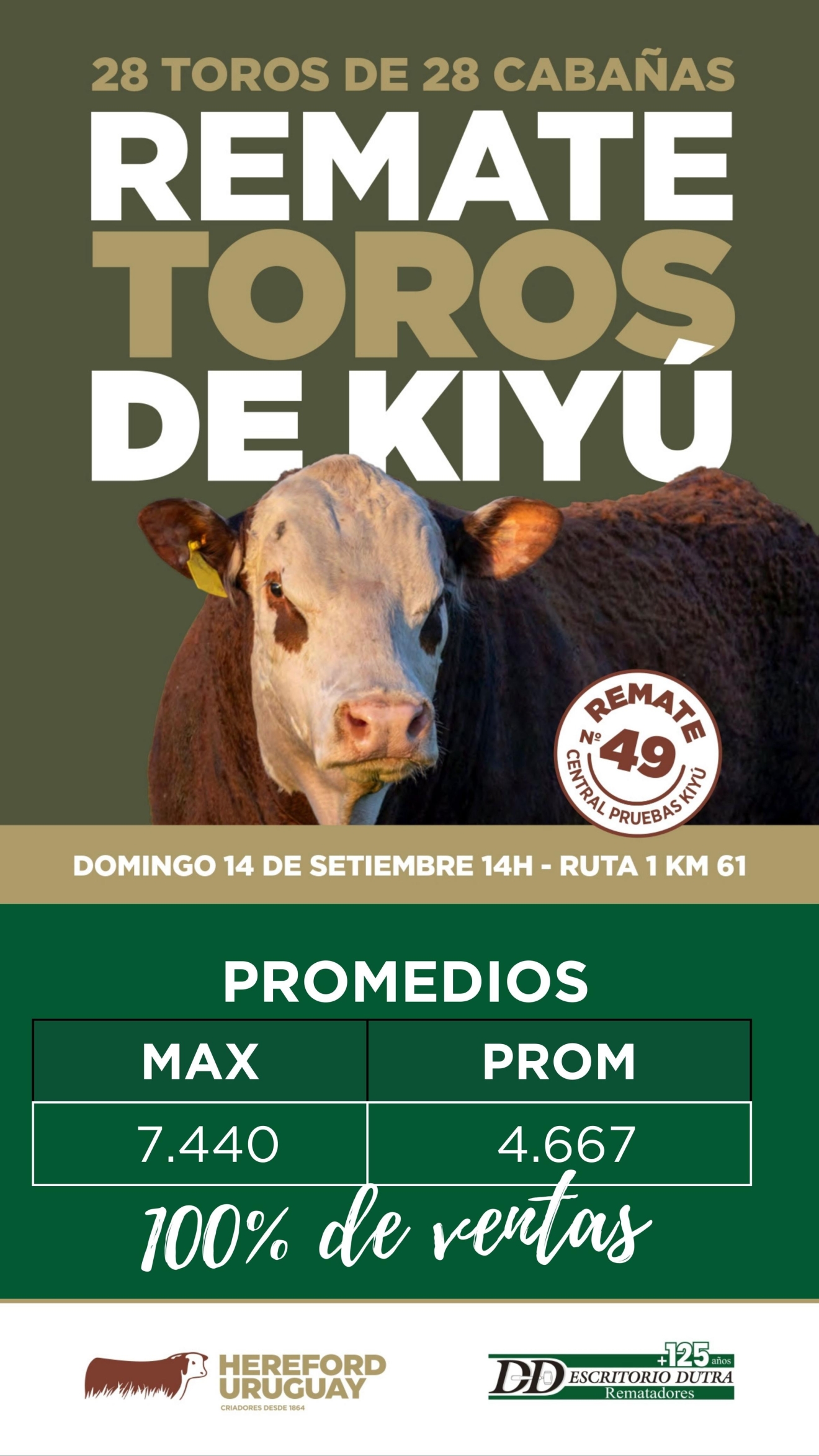 El preámbulo de la zafra de toros tuvo este domingo 14 de setiembre un mojón de referencia para el mercado con la comercialización del 49º remate de la Central de Pruebas de Kiyú de Hereford Uruguay. Y la demanda respondió.