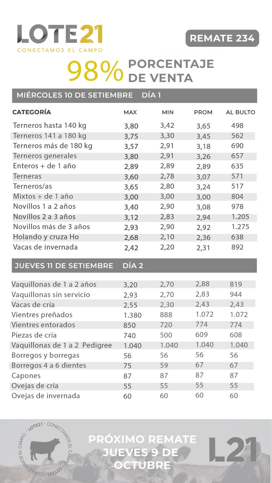 El consorcio Lote 21 cerró este jueves su remate 234 desde el predio de la Rural del Prado con un 98% de ventas. Al igual que lo ocurrido durante el primer día con la invernada, las categorías de cría y vientres también sostuvieron su firmeza.