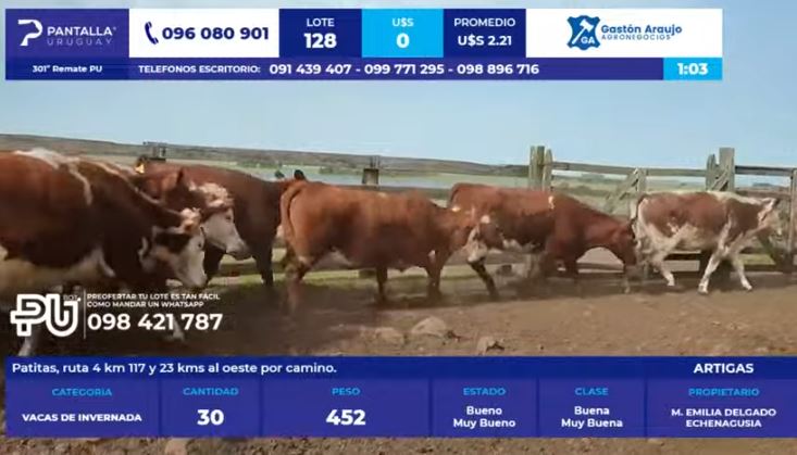El consorcio Pantalla Uruguay tuvo este jueves 30 de octubre su primer día de actividad del remate 301. Tal como se manejaba en lo previo, se dio una corrección a la baja en las categorías de reposición, tras al pico de valores alcanzados en el remate anterior de fines de setiembre.