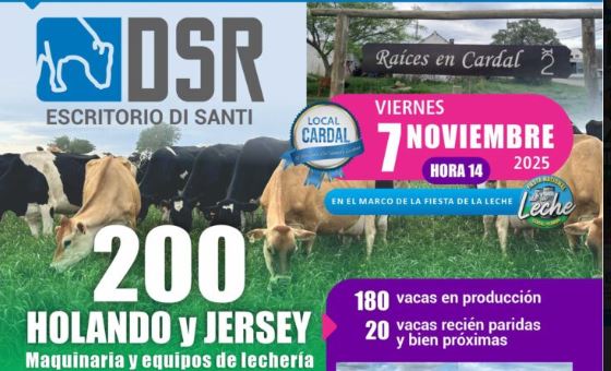 Este viernes 7 de noviembre, a la hora 14, en el local Cardal, el escritorio Di Santi (DSR) realizará la liquidación total del rodeo lechero y equipos de lechería de Raíces en Cardal SRL, de Carla Di Santi, en el marco de la Fiesta de la Leche.