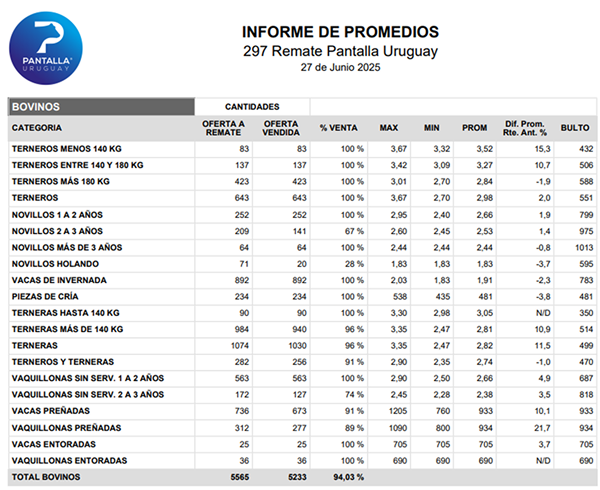 El consorcio Pantalla Uruguay tuvo el pasado viernes su remate 297. Con un 94% de ventas (5.233 cabezas), los terneros hicieron un promedio general de US$ 2,98 por kg en pie (US$ 551 al bulto) y se valorizaron 2% versus el remate anterior. En tanto, los novillos de 1 a 2 años hicieron US$ 2,66 por kg (+1,9%), y los de 2 a 3 años US$ 2,53 (+1,4%).