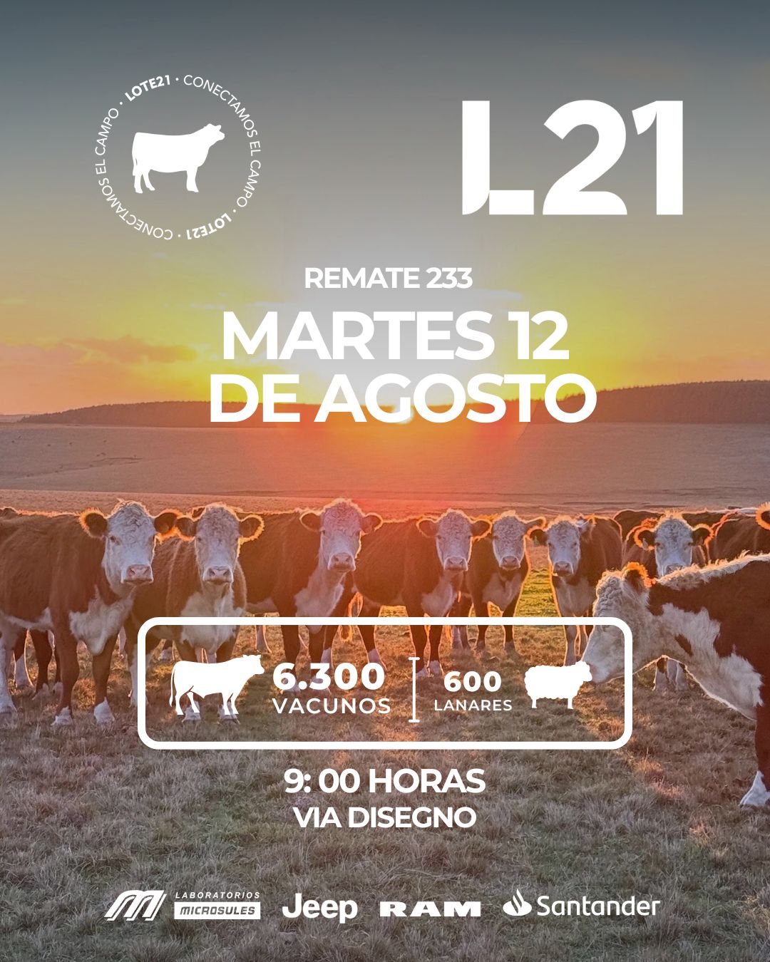 Este martes 12 de agosto, Lote 21 llevará a cabo su remate número 233, ofreciendo 6.300 vacunos y 600 lanares, a partir de las 9 horas, desde la locación vía Disegno.