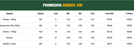 El consorcio Plaza Rural cerró este jueves su primer día de actividad del remate 306 con un 100% de ventas en todas las categorías, con un mercado de reposición que mostró un fuerte dinamismo en su comercialización. Los 2.762 terneros hicieron un promedio de US$ 2,95 por kg en pie (US$ 556 al bulto). En el remate anterior de mayo, el promedio había sido de US$ 2,97 por kg en pie, pero el bulto fue más bajo (US$ 525).
