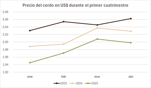 El promedio de este período es un 9% superior al del 2024 y 6,3% frente a 2023. Al analizar en dólares, el resultado es inverso, en 2025 el valor promedio se ubica en US$ 1,98, posicionándose 1,5% por debajo de la referencia de 2024 y cae 3,4% frente a 2023. A pesar de este descenso, entre enero y abril de 2025, hubo una recuperación de los valores del 2,7% en dólares.
